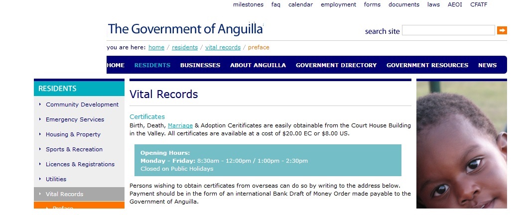 Persons wishing to obtain certificates from overseas can do so by writing to the address below. Payment should be in the form of an international Bank Draft of Money Order made payable to the Government of Anguilla.