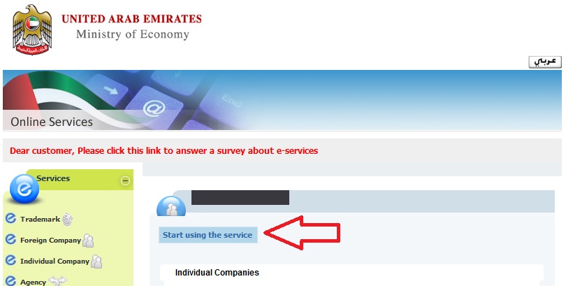 2. Logging in the Ministry of Economy portal www.economy.ae and selecting MoE services, the portal will automatically check if the user is registered in the system or not. Only if the user was registered, the eServices can be used. While, if not, the user will be forwarded to the registration homepage where he/she can register as a company or an individual.