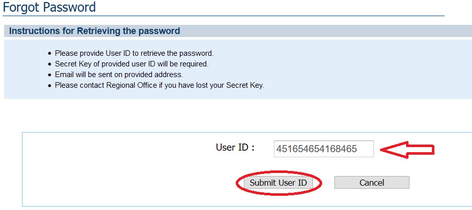 Secret Key of provided user ID will be required. Email will be sent on provided address. Please contact Regional Office if you have lost your Secret Key.