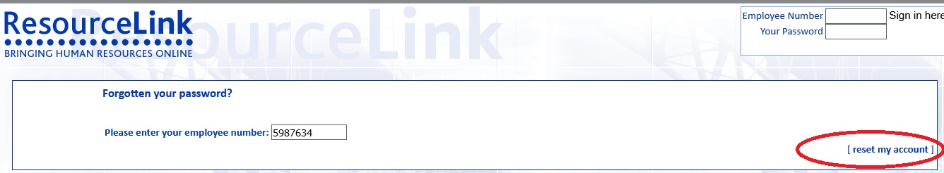 12. Enter your employee number and click on reset my account. A confirmation message will be displayed telling you that an email containing a temporary password has been sent to your inbox. This password will last for 2 hours. If it is not used in that time you will need to complete the procedure again. Click on continue