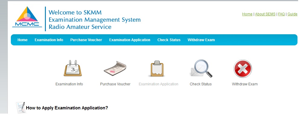 SKMM Exam Management System (SEMS) is an online web application that enables you to submit your application for Amateur Radio Service examinations conducted by MCMC which is Amateur Radio Examination (RAE) and Morse Code Examination (CW), online.