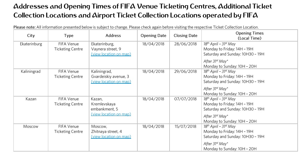 ** Please visit the FIFA Venue Ticketing Centres for Ticket Collection, customer service enquiries and, from 1 May 2018, for over-the-counter Ticket sales (subject to availability).