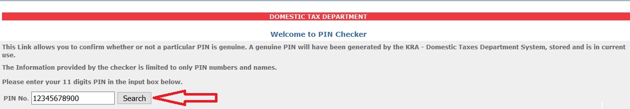 The PIN Checker allows you to confirm whether or not a particular PIN is genuine. A genuine PIN will have been generated by the KRA – Domestic Taxes Department System, stored and is in current use. The Information provided by the checker is limited to only PIN numbers and names.