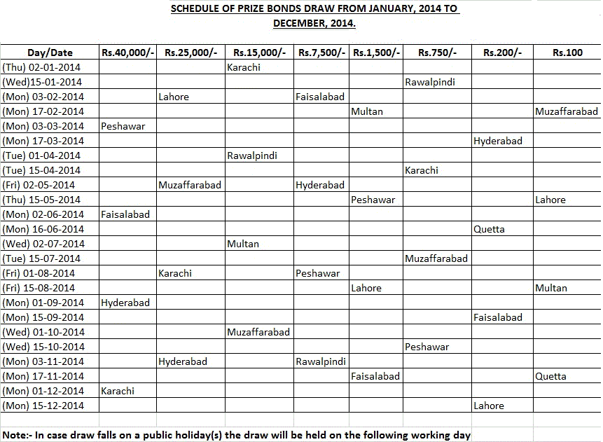 Schedule Of Prize Bonds Draws For Calendar Year 2014 :