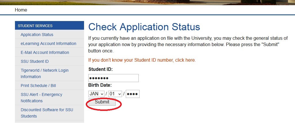 c. If known, input your 9-digit SSU ID# and DOB where instructed to do so-click “Submit”.