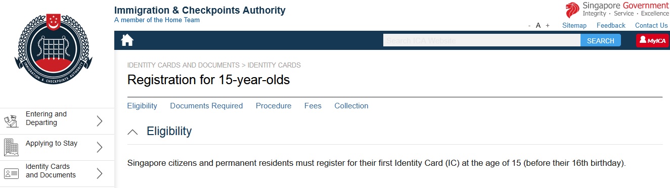 ** Singapore Citizens and Permanent Residents who reach the age of 15 must register for their Identity Cards (IC) before their 16th birthday.