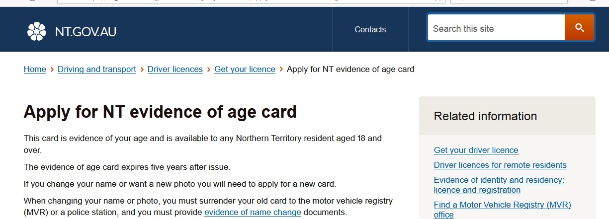 Website : https://nt.gov.au/driving/licences/apply-for-nt-evidence-of-age-card