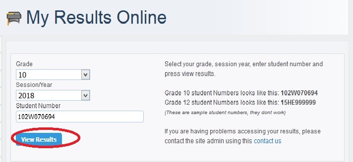 Select your grade, session year, enter student number and press view results.