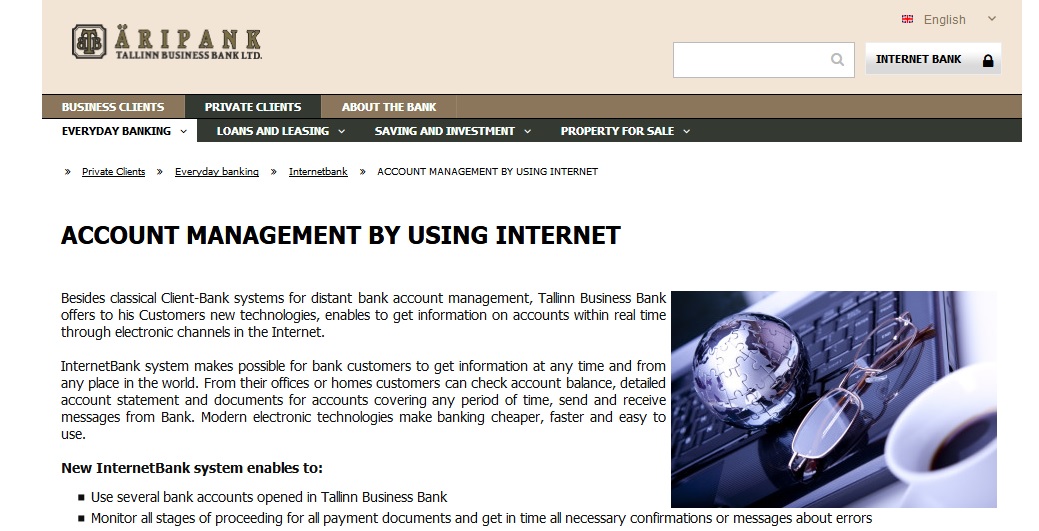 Besides classical Client-Bank systems for distant bank account management, Tallinn Business Bank offers to his Customers new technologies, enables to get information on accounts within real time through electronic channels in the Internet.