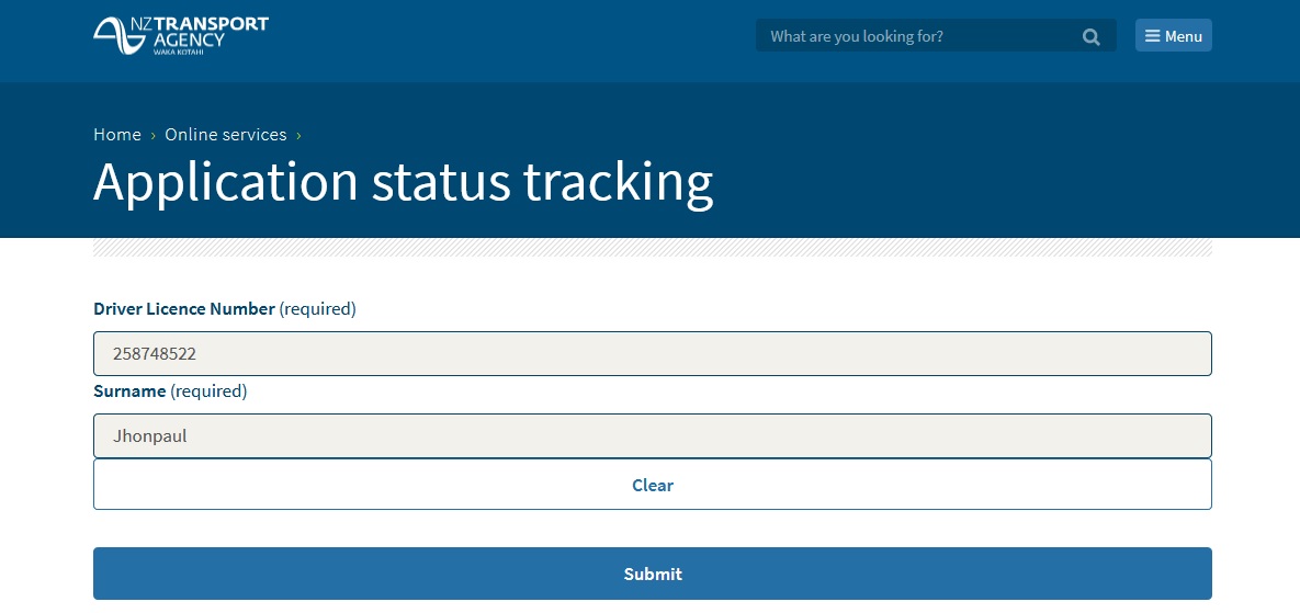 Website : https://www.nzta.govt.nz/online-services/application-status-tracking/