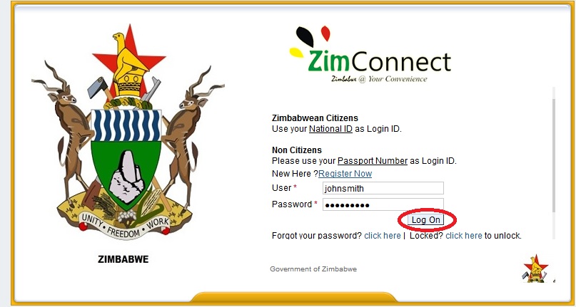 1. Log onto the Zimconnect Portal at zimeservices.pfms.gov.zw/irj/portal/anonymous/login
