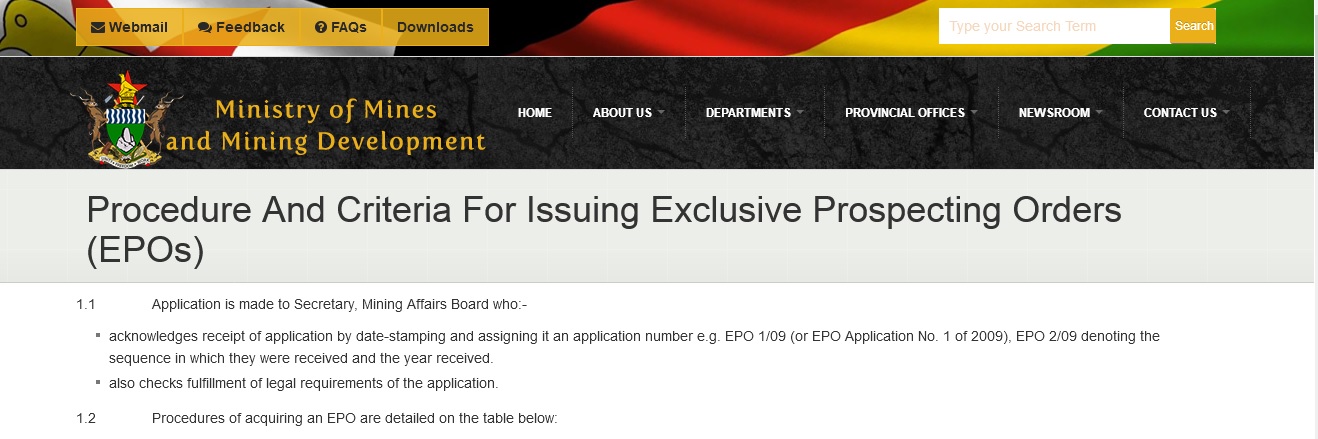 Website : http://www.mines.gov.zw/?q=procedure-and-criteria-issuing-exclusive-prospecting-orders-epos
