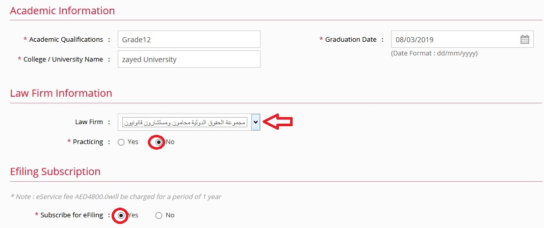 ** Submitting all required documents as instructed by Ministry of Justice’s website moj..gov.ae, however such lawyer shall be enrolled after being joined to an Emirati law firm.