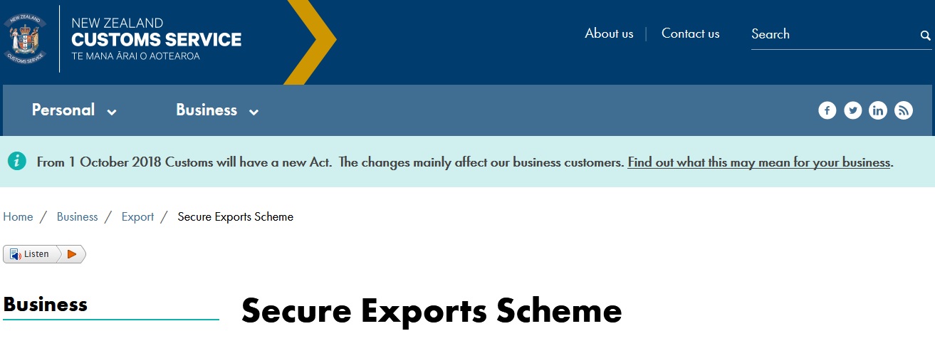 Website : https://www.customs.govt.nz/business/export/secure-exports-scheme/