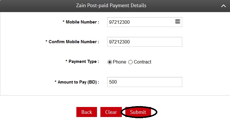 Please enter “Zain Post-paid Payment Details” then click on “Submit”