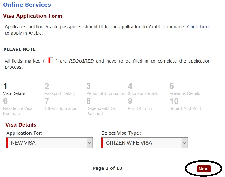 Read the procedures carefully and Click Apply button under Visa Application Form. Then Select the Application For and Visa type and click Next button.