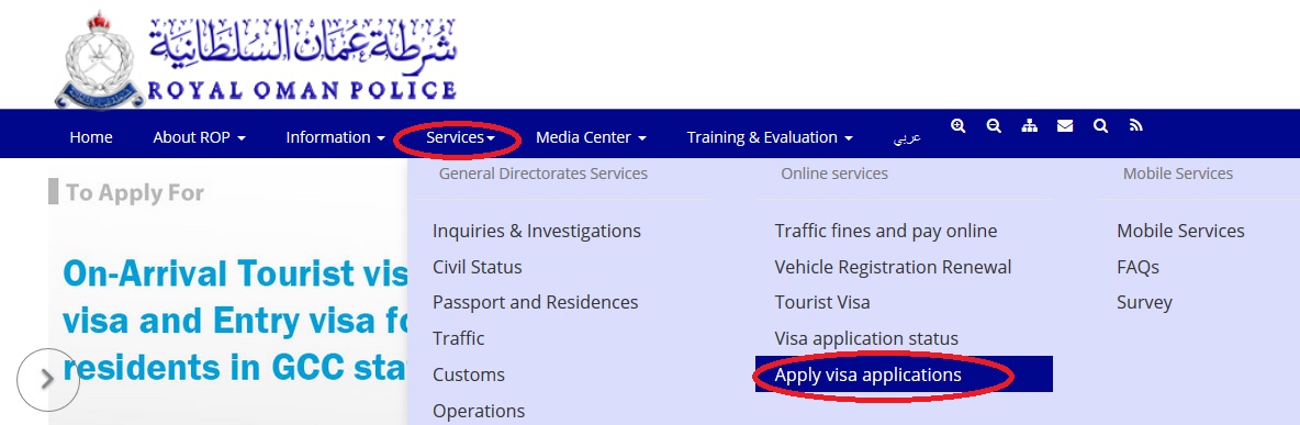 Visit the official website of Royal Oman Police provided above and Services link in the Menu bar and Select Apply for Visa Application.