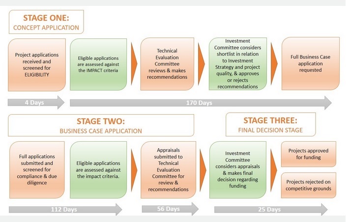 The Jobs Fund has a two-stage application process; the Concept Application Stage and Full Application Stage. The application process begins when a call for proposals opens, and ends once a project has been approved by the Investment Committee.