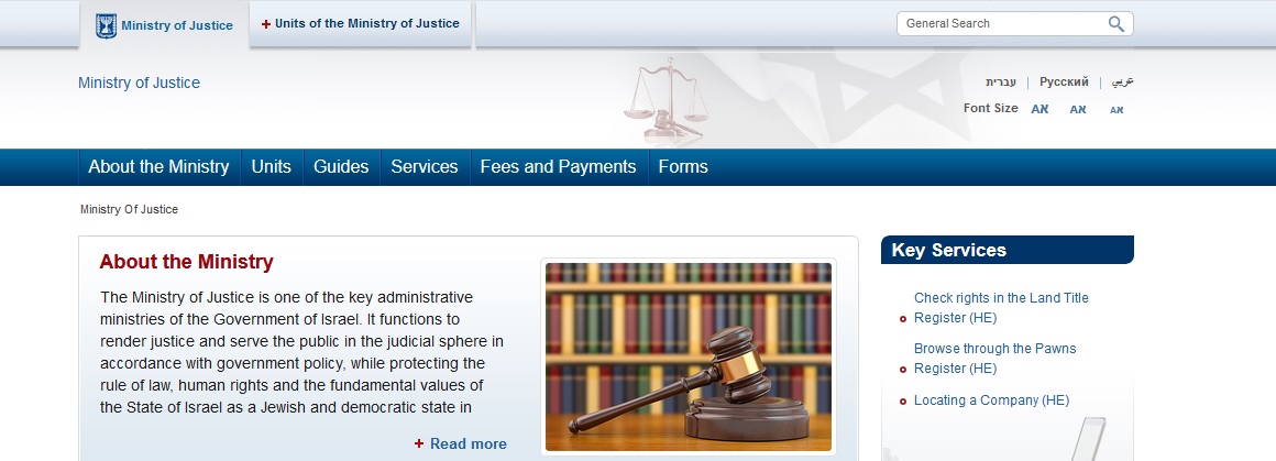 The Ministry of Justice is one of the key administrative ministries of the Government of Israel. It functions to render justice and serve the public in the judicial sphere in accordance with government policy, while protecting the rule of law, human rights and the fundamental values of the State of Israel as a Jewish and democratic state in which all are equal before the law.