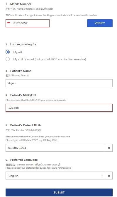 ** You will receive an SMS at the mobile number you register below, as soon as there are slots available for booking. If you require any assistance, please call the MOH COVID-19 hotline at 1800-333-9999.