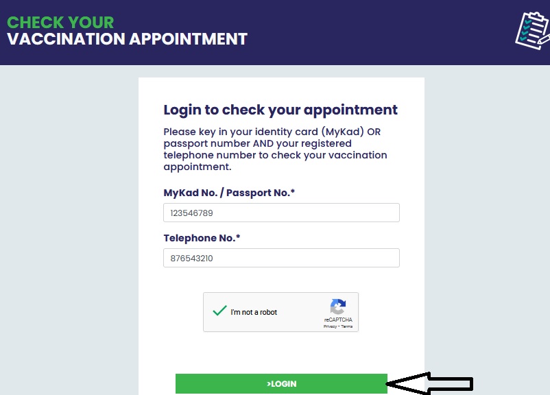 Please key in your identity card (MyKad) OR passport number AND your registered telephone number to check your vaccination appointment.