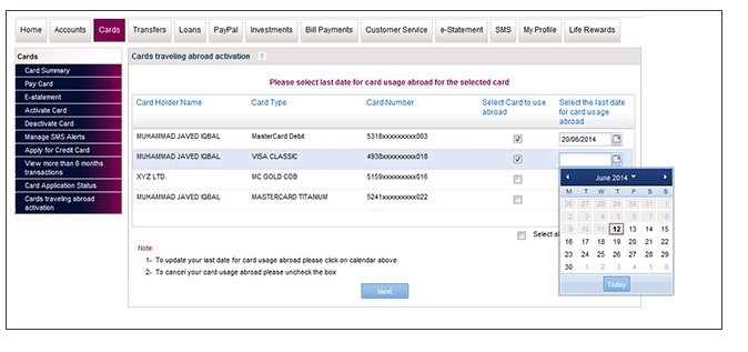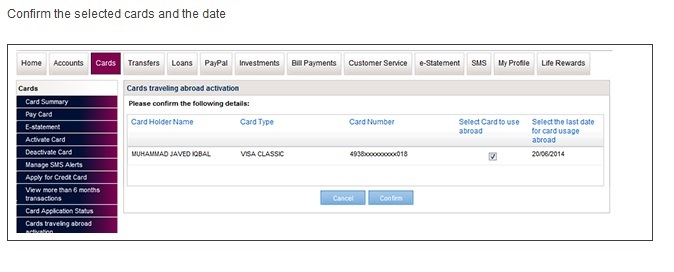 ** Select the cards that you would like to activate and select the latest date for usage abroad