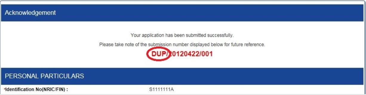 Applicants may collect the duplicate COCs at Police Cantonment Complex or opt to have it mailed to the address provided in the application form.For collection, please bring along a copy of the acknowledgement slip, generated at the end of the application (sample below) and an identity document for verification.