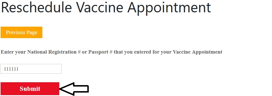 Step 1 : Enter your National Registration # or Passport # that you entered for your Vaccine Appointment