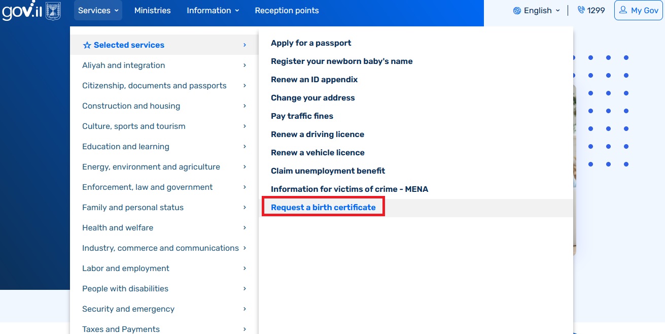 You can request a birth certificate online for someone who was born in Israel for free. You’ll be sent the certificate by post within one week. You can ask for a bilingual certificate in Hebrew and English.