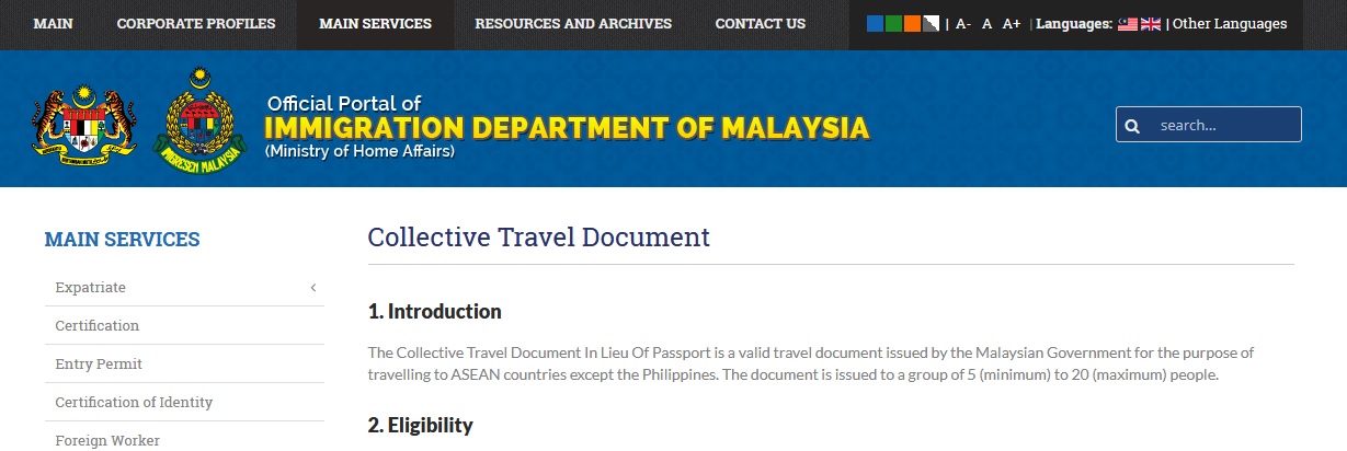 The Collective Travel Document In Lieu Of Passport is a valid travel document issued by the Malaysian Government for the purpose of travelling to ASEAN countries except the Philippines. The document is issued to a group of 5 (minimum) to 20 (maximum) people.