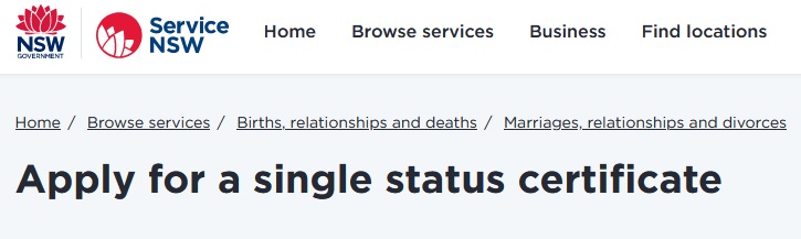 Single Status Certificate verifies that you’ve not been married in NSW during a specified period of time. You can apply for a single status certificate in person at a service centre, or by mail. Certificates are sent to you by the NSW Registry of Births Deaths & Marriages, using registered post. You cannot get a certificate from a service centre. If you’re planning to marry overseas, or if you’re returning to your country of residence to get married, you may need a single status certificate.