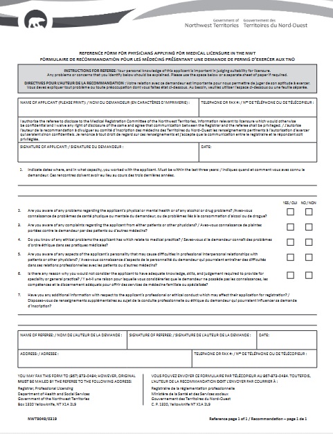 ** Three references using the Reference Form for Physicians Applying for Medical Licensure in the NWT.