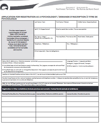 Application Form : https://www.hss.gov.nt.ca/sites/hss/files/resources/psychologist-license-application-package.pdf