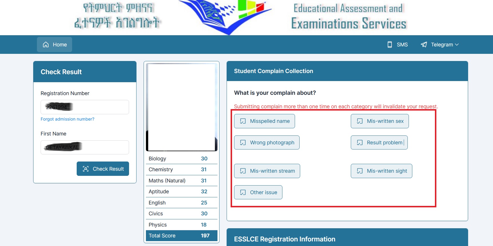 Candidates who have a complaint about the results of the 2015 school year examination can submit their complaints on eaes.et without the need to come in person and you can see your result and take a soft copy or print your temporary certificate until you receive the original certificate.