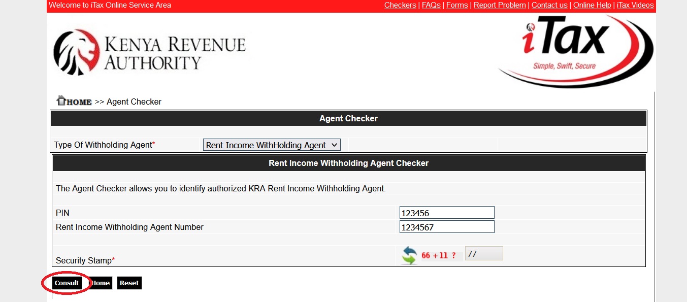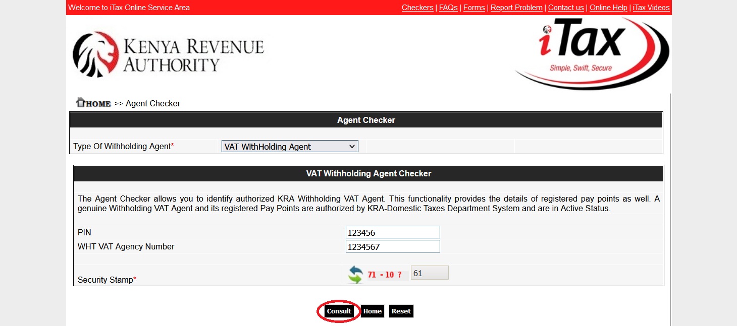 The Agent Checker allows you to identify authorized KRA Withholding VAT Agent. This functionality provides the details of registered pay points as well. A genuine Withholding VAT Agent and its registered Pay Points are authorized by KRA-Domestic Taxes Department System and are in Active Status.