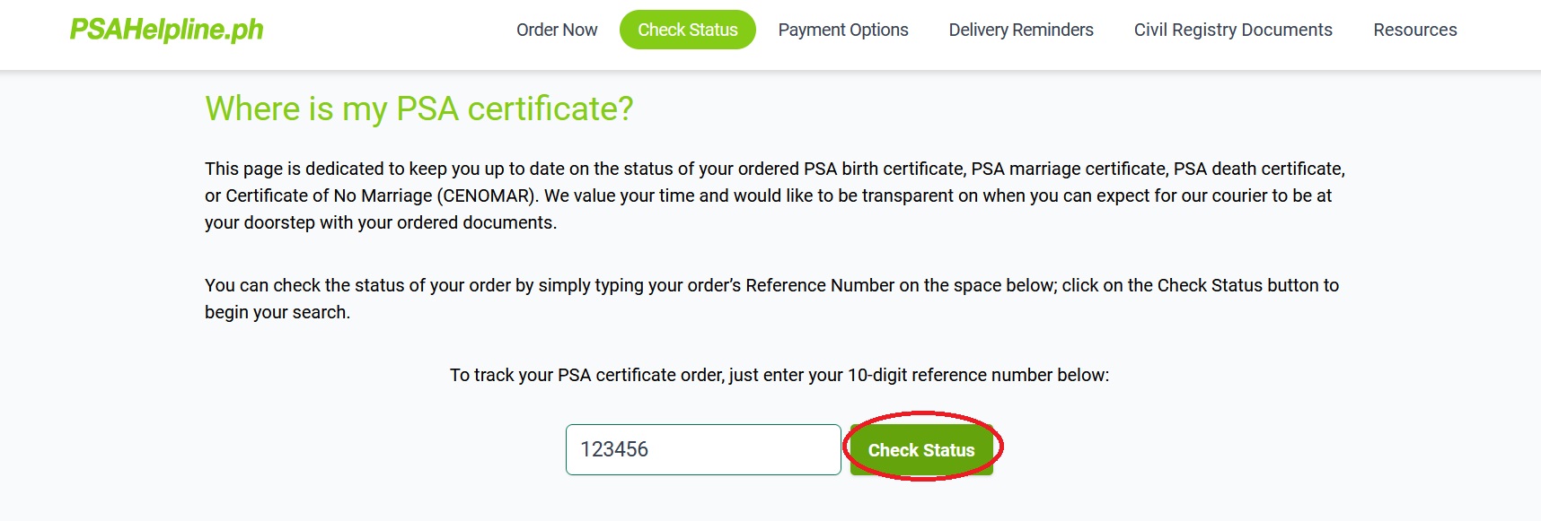 This page is dedicated to keep you up to date on the status of your ordered PSA birth certificate, PSA marriage certificate, PSA death certificate, or Certificate of No Marriage (CENOMAR). We value your time and would like to be transparent on when you can expect for our courier to be at your doorstep with your ordered documents. You can check the status of your order by simply typing your order’s Reference Number; click on the Check Status button to begin your search.