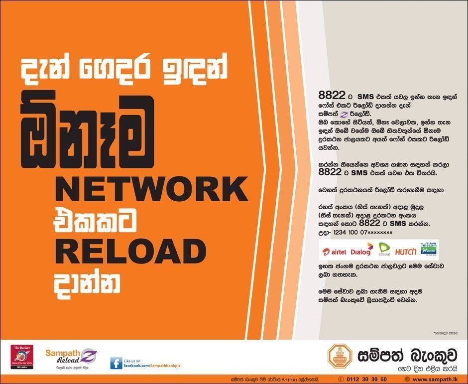 Reload your phone from anywhere any time of day by sending an SMS to 8822. This service is especially provided to all Sampath Bank account holders.