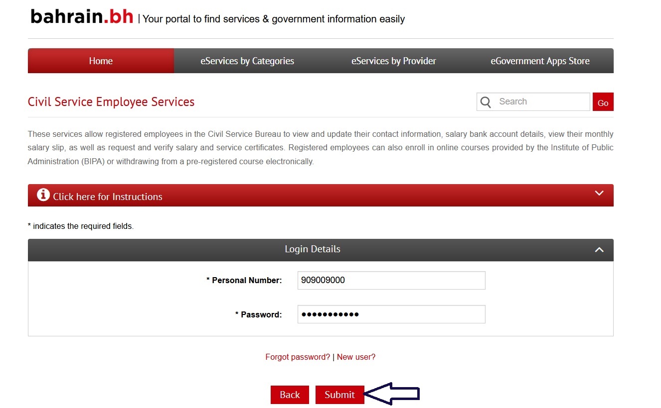 These services allow registered employees in the Civil Service Bureau to view and update their contact information, salary bank account details, view their monthly salary slip, as well as request and verify salary and service certificates. Registered employees can also enroll in online courses provided by the Institute of Public Administration (BIPA) or withdrawing from a pre-registered course electronically.