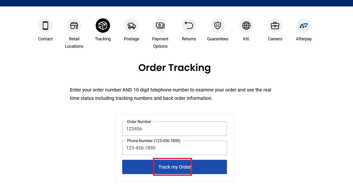 Enter your order number AND 10-digit telephone number to examine your order and see the real time status including tracking numbers and back order information.