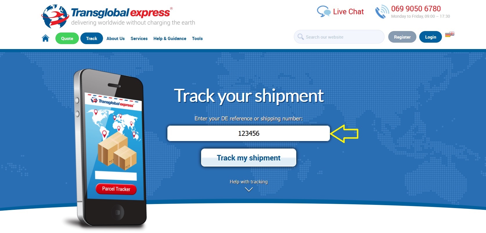 The shipping number is a multi-digit number (which may also contain letters) assigned to your shipment when you book one of our DHL, UPS, DPD, TNT or USPS services. To track your shipment, you can enter either the service provider’s shipping number or your DE reference number from Transglobal.