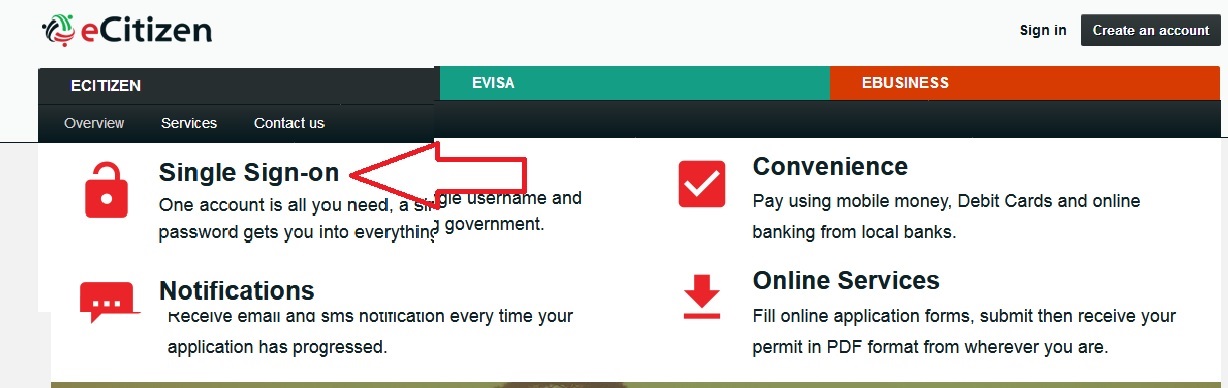 You need a Single Signon account to sign up with eCitizen. Click on the “Login” link at the top right corner of any page and you will be led through simple registration steps.