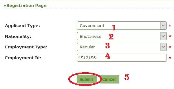 1. Regular employee – Insert Employment Id No. assigned by the Royal Civil Service Commission (RCSC). The employee details will be fetched from the RCSC.