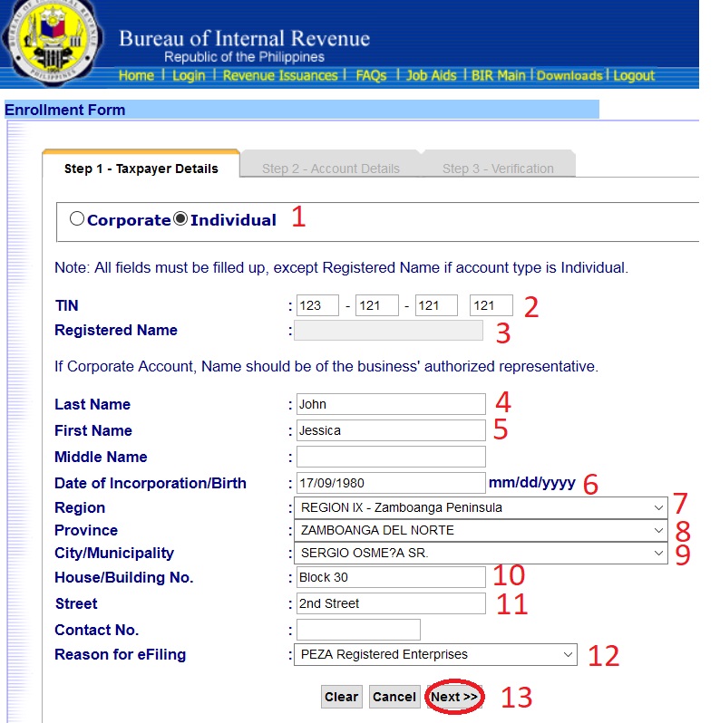 5) The online Enrollment Form screen will now be displayed. Take note that the field for the TIN and the Registered Name of the taxpayer are already Pre-Filled. The additional user may now fill-up the enrollment form in accordance with the same procedures provided for in Number 3 to 6 of Scenario 1.