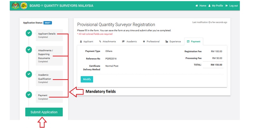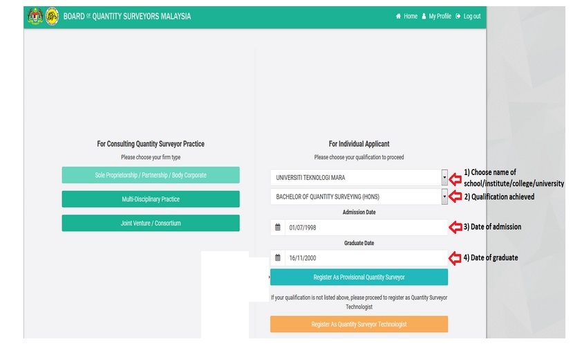 i) Choose according to your application type ; Registered Graduate QS, Registered Temporary QS, Registered QS Practices