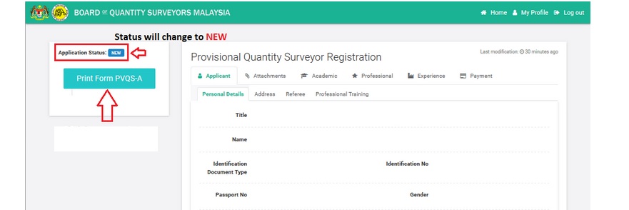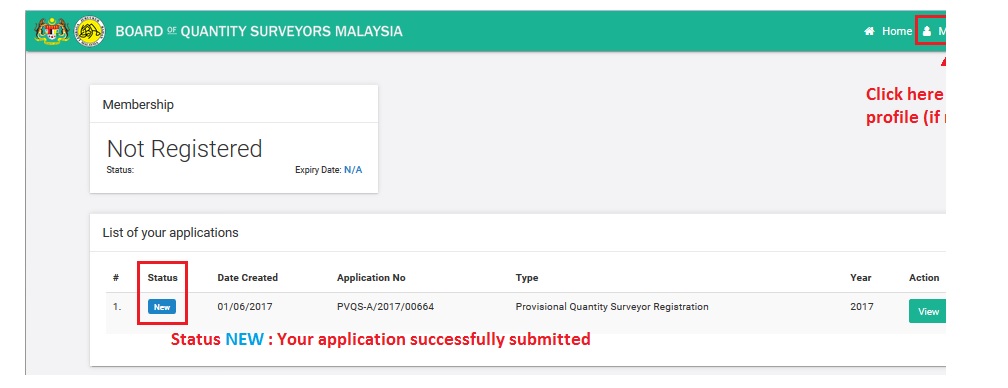 Your application status will be display as ‘NEW’ once your application successfully submitted