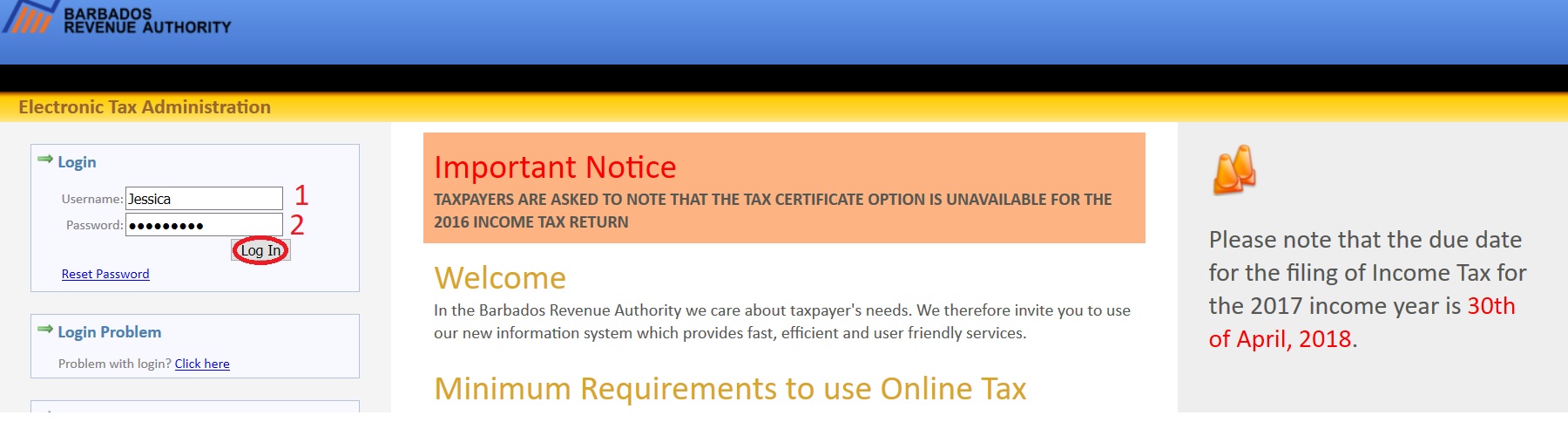 Go to the Electronic Tax Administration website of Barbados Revenue Authority link provided above. You are required to login with your details to file income tax.