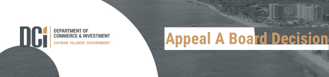 ** Appeals shall be by notice in writing addressed to Appeals Tribunal, Department of Commerce & Investment accompanied by a non-refundable processing fee of CI$100.