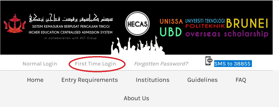 3. Applicants have to go to the HECAS portal at https://hecas.moe.gov.bn/ and click First Time Login to enter the received Password. Then click the ‘Submit’ button to proceed.