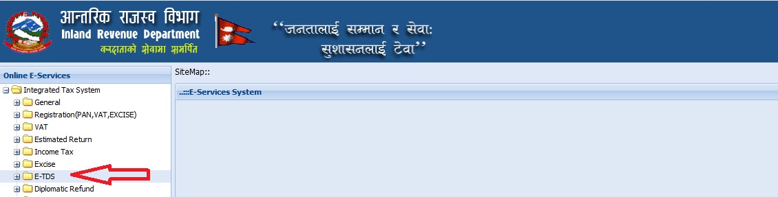 Access to e-TDSS is from the official website of Inland Revenue Department which is www.ird.gov.np. In the top menu there is a menu item, which reads e-TDS System. By clicking the link user will be directed to e-TDS System site.