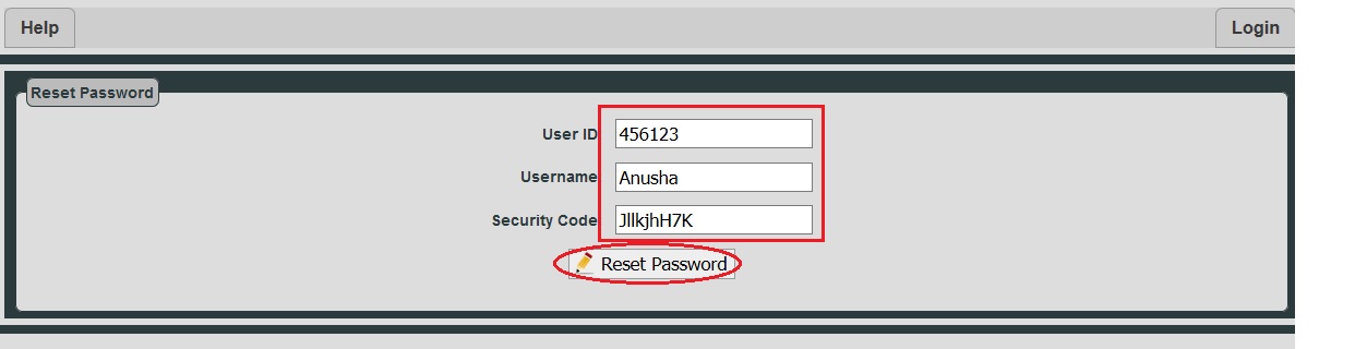 When you are on the Reset Password form, you have to type your ‘User Id’ in the User Id field, your ‘Username’ in the Username field and your ‘Security Code’ in the Security Code field as shown in the image above, then click Reset Password button.